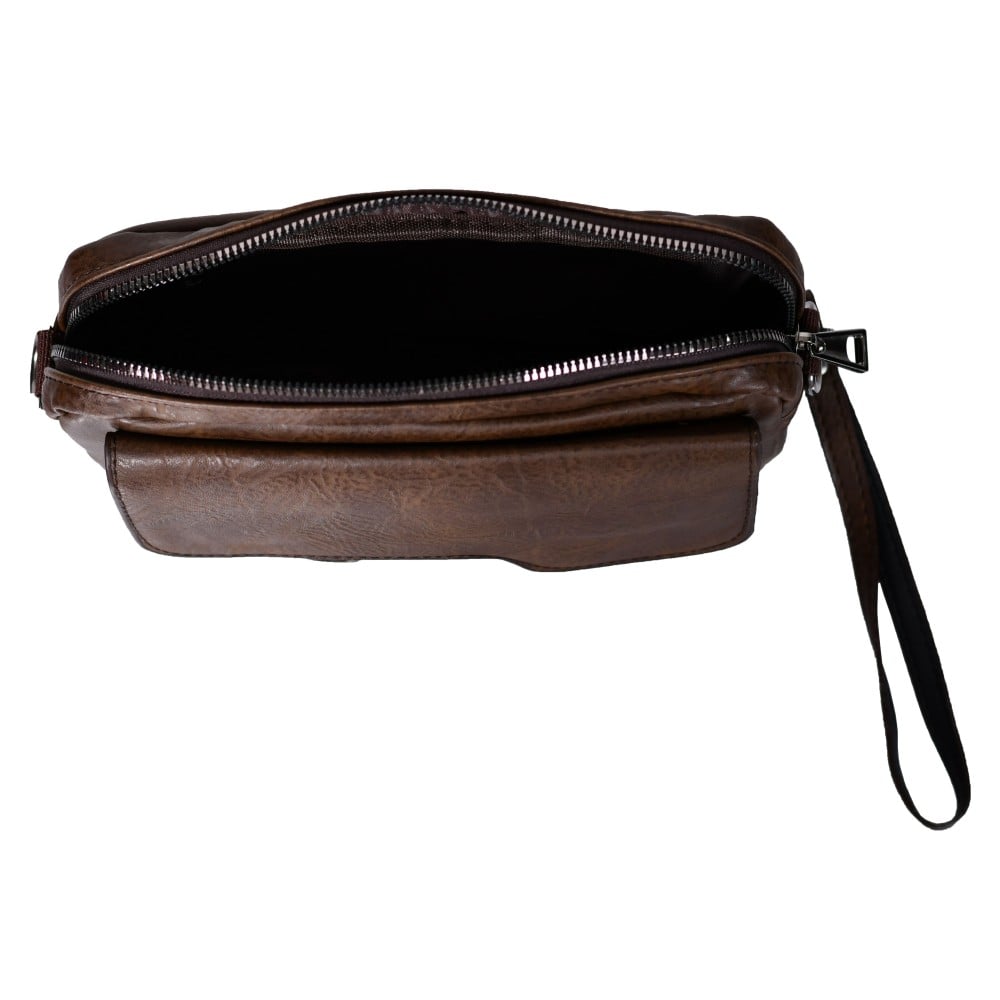 شنطة يد جلد بمقبض معصم مع فتحة داخلية للنقود والبطاقات و الاكسسورات بني